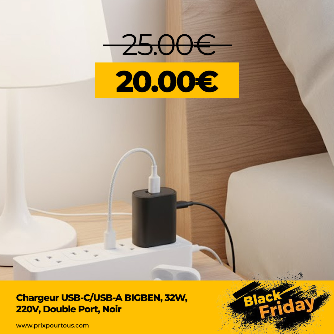 DOUBLE PORT: Chargeur équipé d’un port USB-C et d’un port USB-A pour charger simultanément deux appareils PUISSANCE: Capacité de charge rapide de 32W pour une alimentation optimale de vos appareils compatibles COMPATIBILITÉ: S’adapte aux prises électriques européennes standard 220V avec broches métalliques robustes DESIGN COMPACT: Boîtier noir élégant avec finition rainurée pour une meilleure dissipation […]